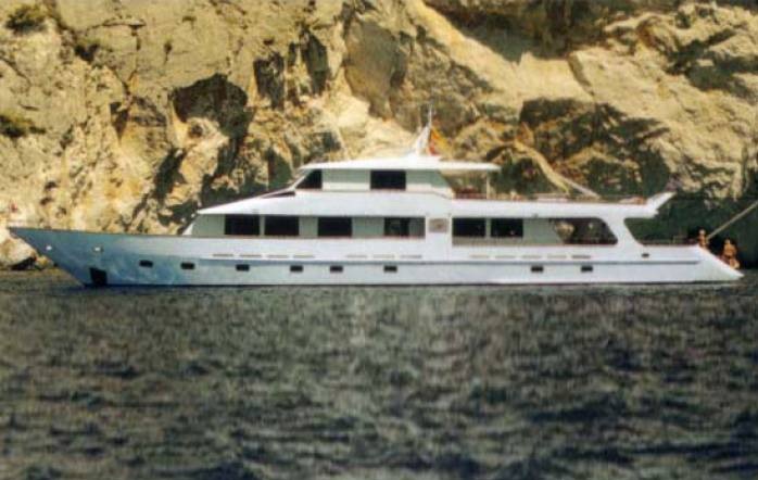 This 32 meters navetta motro yacht can accommodate 12-14 guests in 6 cabins. Her main deck features the saloon and dining area, the galley and the VIP cabin. Her mid lower deck features the Master cabin which also has a sofa and her two twin cabins. Two more twin cabins are located in the stern lower deck. All cabins have ensuite facilities and are fully air-conditioned. she also has a seventh cabin with bunk beds and ensuite facilities which can be available to the guests upon request.
