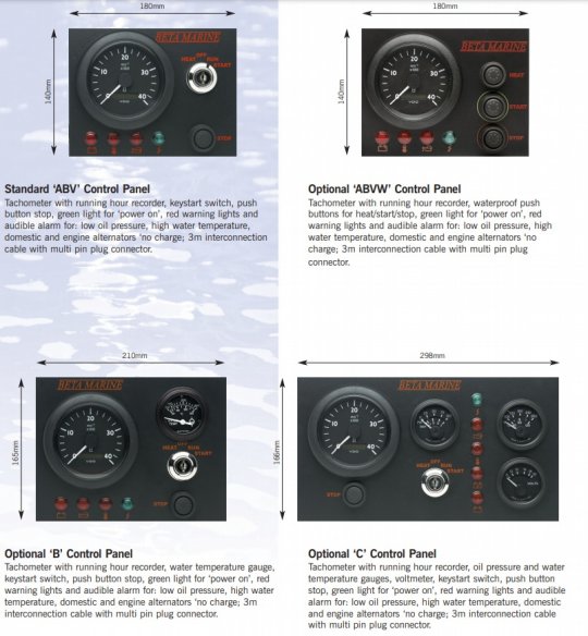 - Complete with ‘ABV’ control panel with tachometer with running hour recorder, keystart switch, push button stop, green light for ‘power on’, red warning lights and audible alarm for: low oil pressure, high water temperature, domestic and engine alternators ‘no charge; 3m interconnection cable with multi pin plug connector.