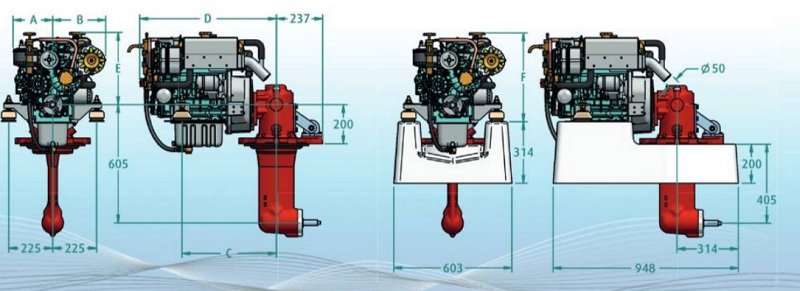 Engine with shallow sump, feet & Technodrive SeaProp 60 leg * - GRP base & propeller not included
