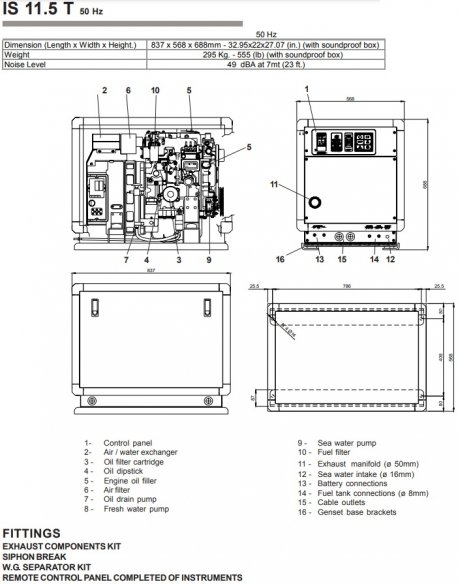 Two separate pumps contribute to the flow of the coolant and the sea water. The cooling of the air inside the gen-set is obtained through a seawater/air heat exchanger.
