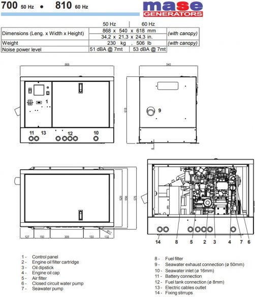 Mase diesel marine generator Mariner 910 S (one phase range 9 kv) 50 hz 3000 RPM with Intercooler System ,Soundproof for sale in Greece by Aibsailing