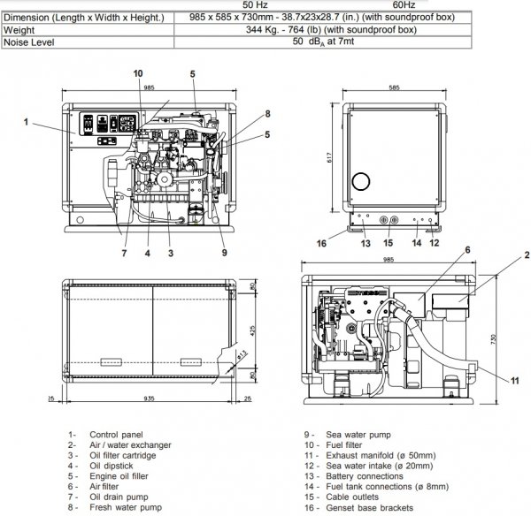 Two separate pumps contribute to the flow of the coolant and the sea water. The cooling of the air inside the gen-set is obtained through a seawater/air heat exchanger.