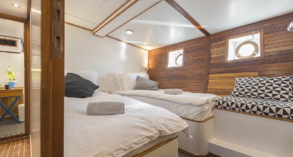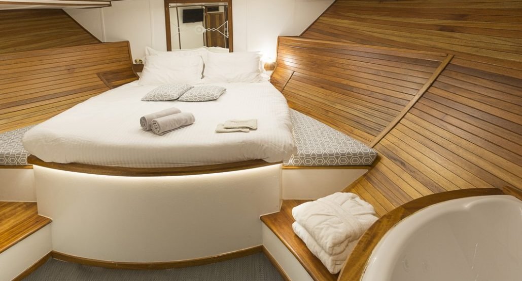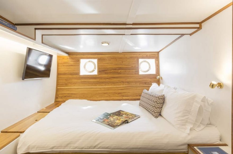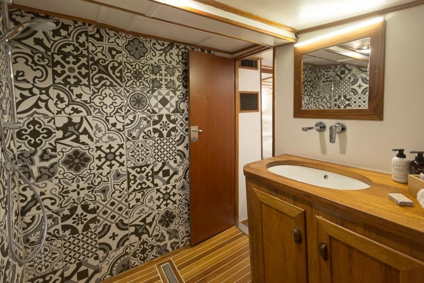 Her interior décor is light and airy, offering plenty of relaxing areas to enjoy. The open plan main salon is in a raised position at deck level, allowing for wonderful sea views. On the lower deck, there are 4 guest cabins, each with private en- suites.