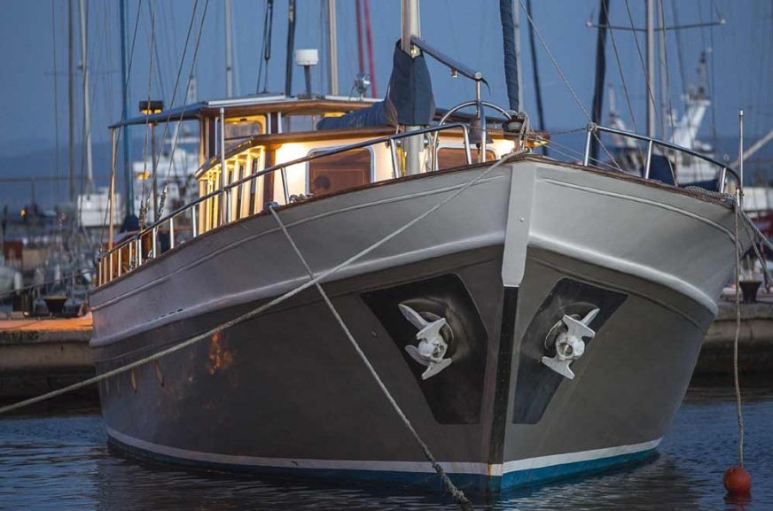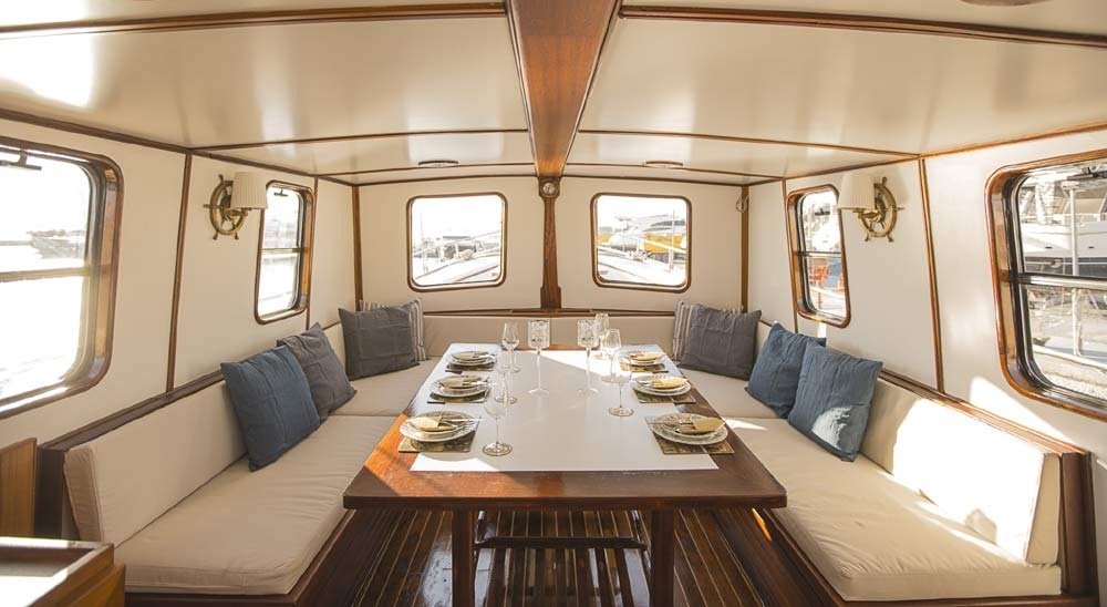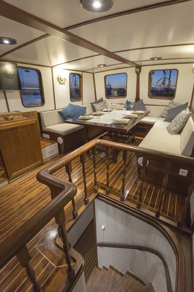 Motor sailer COSMOS decks are laid to teak, offering alfresco dining and seating aft, as well as further seating and sunning on the foredeck. Her traditional styling is perfectly paired with clean and modern fixtures and fittings, including refurbished woods and all new brightwork. Twin Cummins engines power the yacht with cruising speeds of 10 knots and top speeds of 13 knots.