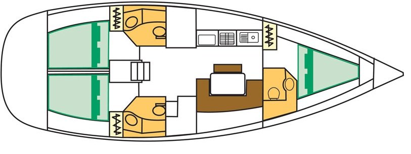 Cyclades 43 is avaible in two versions ,cyclades 43,3 with 3 double cabins and 3wc and cyclades 43,4 3 double cabins 1 bunk bed and 2 wc, there is also additional accomodation to the salon for both versions